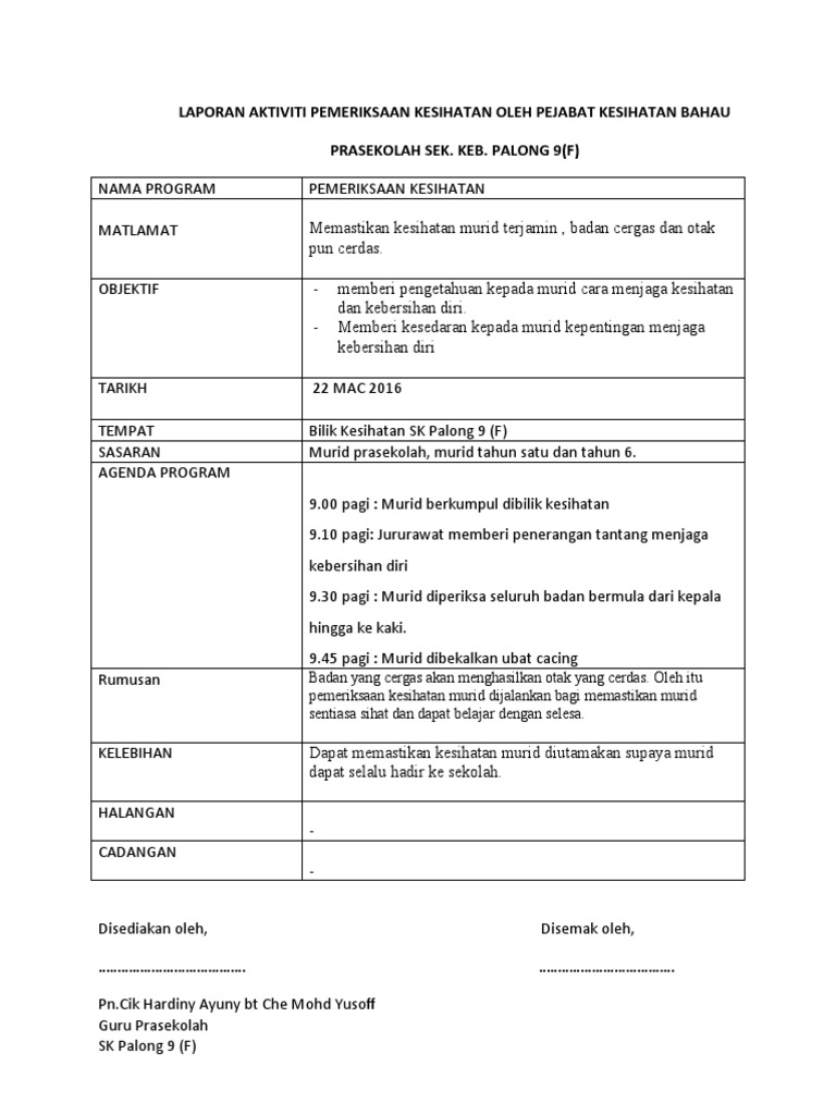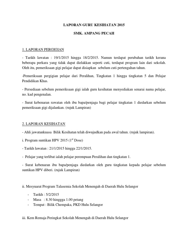 Meningkatkan pengetahuan mengenai amalan kesihatan diri menggalakkan amalan cara hidup sihat dan memastikan persekitaranm sekolah yang bersih ceria selamat dan sihat. QGK3023 - PROGRAM KESIHATAN SEKOLAH LAPORAN PELAKSANAAN PROGRAM KESIHATAN DI SEKOLAH SERTA KESANNYA KEPADA PEMBELAJARAN MURID DISEDIAKAN OLEH. Contoh penulisan laporan tahunan unit kokurikulum kadet remaja sekolah motto.